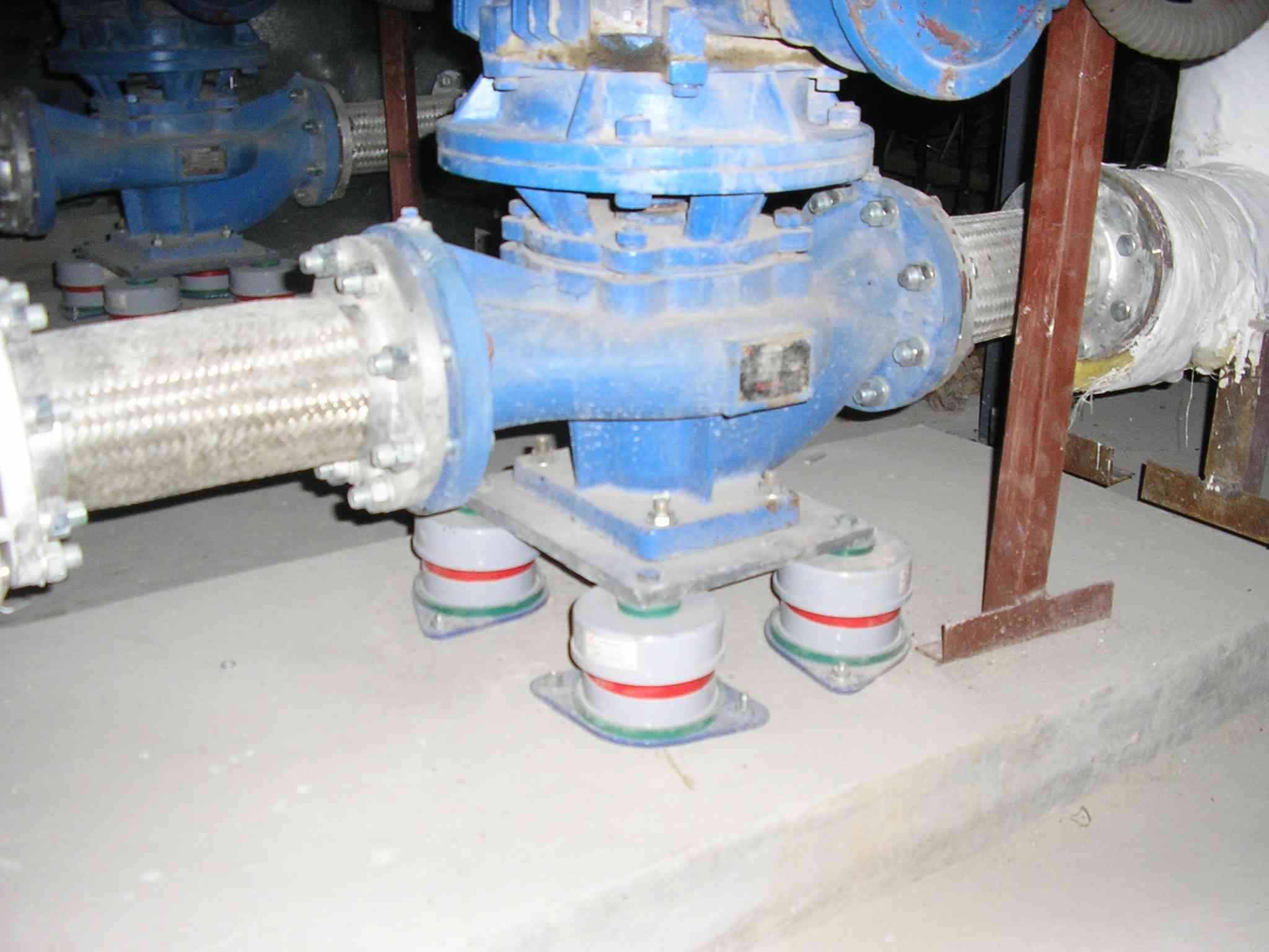 3)機(jī)組振動噪聲治理:水泵運行中由機(jī)組振動引起的,是一個技術(shù)難點,將振動源與承載物或地基之間的剛性連接,改為彈性連接,利用彈性裝置的隔振作用,減弱振動源與承載物或地基之間的能量傳遞,降低振動對環(huán)境的影響并通過基座傳播的固體聲污染是治理中的主要問題,只有針對結(jié)癥所在,認(rèn)真計算,合理使用水泵機(jī)組專用復(fù)合隔振臺,才能達(dá)到治理目的。